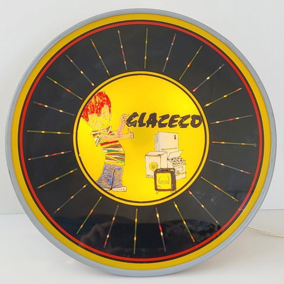 Good overall condition. Usual signs of wear, particularly on the back. Diameter 43 cm. Depth 11 cm. Working. A multicolored disc rotates inside the sign, creating a very original kinetic and psychedelic effect.
