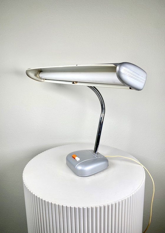 Wide MCM 1960-1970s vintage table piano-style lamp with a flexible chrome-colored gooseneck arm. Made of metal and plastic, 'on/off' buttons on the base. Likely from Japan.