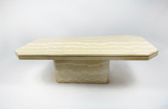 Elegant vintage coffee table from the 1970s, crafted in solid travertine with a beautiful wavy pattern. The sculptural design features a generously sized top resting on a strong central pedestal, highlighting the beautiful natural veining and warm tones of the stone.