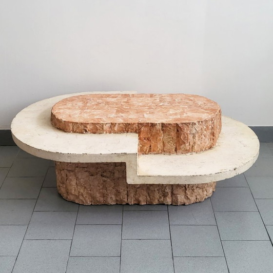 41 cm. A very beautiful vintage table. The orange Mactan stone top is in good condition. Length 117 cm. Width 72 cm. Height 26 cm. Cream. Numerous signs of wear. The red part is in fair condition. Numerous signs of wear and chips, particularly on the outer edge of the beige tabletop.