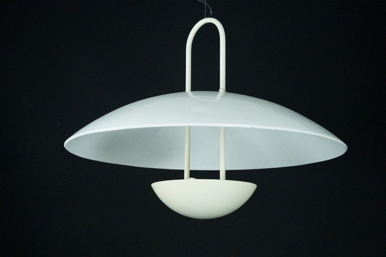 Elegant pendant lamp from the 1990s featuring a distinctive modernist design. The lamp showcases a glossy white finish and a sculptural double-dome structure — a large glass shade paired with a smaller lower bowl that houses the bulb. The upper “mushroom” dome is made of white glass, adding a refined contrast to the metal elements. The lamp is in very good vintage condition, with only minimal signs of age. For safer transport, it will be shipped disassembled. Perfect for creating a sophisticated, retro-inspired atmosphere in dining rooms, living spaces, or design studios. Fully functional with EU standard wiring, easily adaptable to US standards upon request.