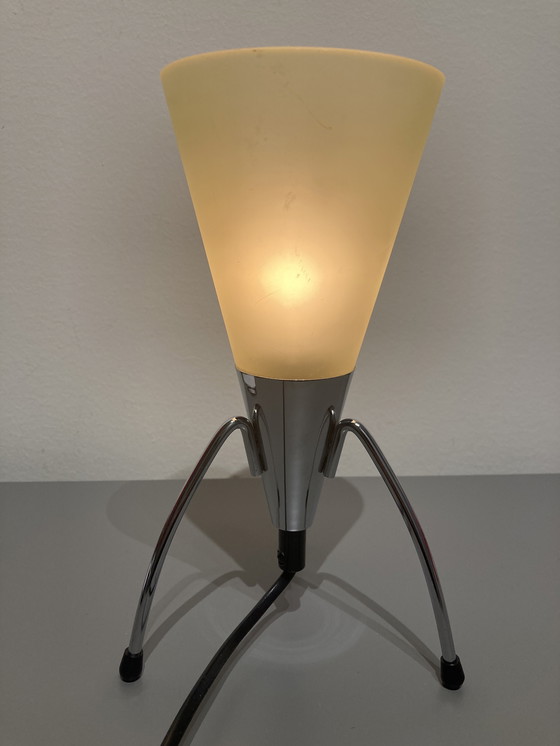 Vintage Space table lamp on 3 chrome legs with frosted glass in a faint yellow-green color.