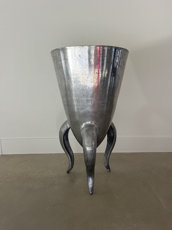 This Vintage 70s Aluminium Vase is a unique piece that embodies the design aesthetics of its era. Crafted from durable aluminium, it features a distinctive shape with three elegantly curved legs. Its silver finish adds a touch of retro charm, making it a perfect addition to any vintage or eclectic decor. Despite some signs of wear, it remains a striking decorative item. Only found online (in better condition for 540 euro).