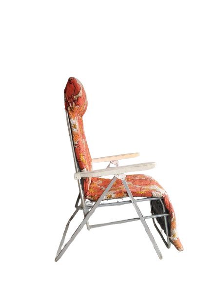 Discover the timeless charm of this vintage 1970s chaise lounge, a folding sunbed that combines functionality with retro aesthetics. Its distinctive design, adorned with vibrant floral patterns, evokes an era when style and comfort went hand in hand.