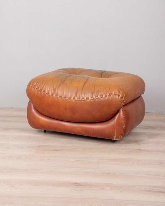 Footstool pouf with wheels, brown leather upholstery, "Sapporo" model, design Mobil Girgi, 1970s.