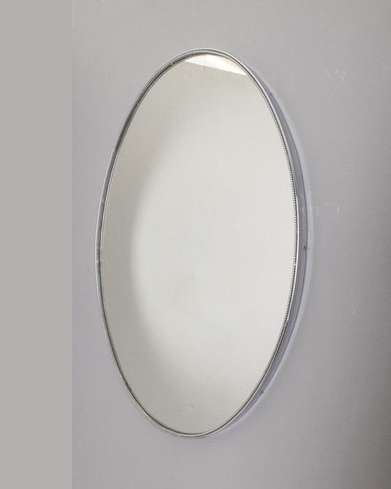 Oval wall mirror with chrome-plated and decorated metal frame, Italian design, 1970s.