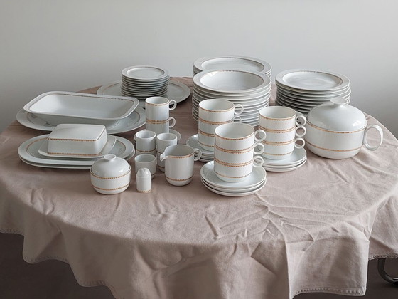 A beautiful, timeless Rosenthal tableware set from around 1969. Probably from the Form 2000 series (like Goldband) with a geometric gold motif. The complete set consists of:
