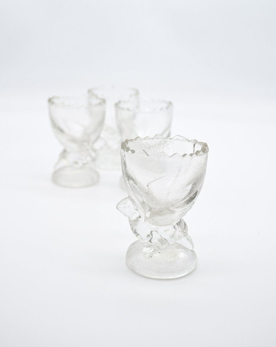 Bring a touch of nostalgia to your breakfast table with this set of four vintage egg cups from the '90s. Crafted from beautifully shaped, frosted glass, these egg cups feature a charming chicken design that's both playful and elegant. Perfect for a cozy brunch or a special weekend breakfast.