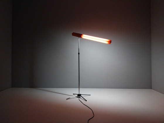 Original vintage AEG architect's floor lamp from the 1970s, finished in chrome with an orange plastic light bar, suitable for fluorescent tubes. The lamp is height-adjustable and features an adjustable arm/shade, allowing for easy adjustment of the light. Originally designed as functional work lighting for architects' and drafting offices, it now makes a highly suitable statement piece in a modern, mid-century, or industrial interior. Ideal for use as a reading lamp next to a sofa or armchair, as atmospheric accent lighting in the living room, or as functional lighting in a work or studio corner. The sleek, industrial design and striking color make this lamp both practical and decorative.
