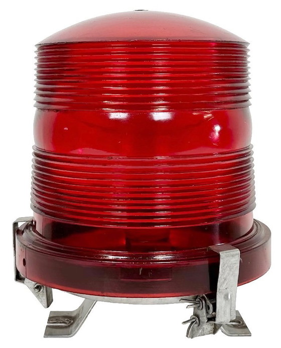 Vintage industrial airport runway floor lamp made by Polam Wilkasy in Poland during the 1960s. It features an iron floor mounting and a red plexiglass cover. The diameter of the light is 23 cm. The weight is 1.7 kg. It can be used also as a ceiling, wall, or table lamp.