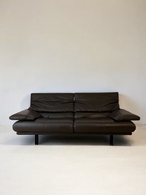 This timeless 80s vintage 'Alanda' sofa in brown leather was designed by Paolo Piva in the 1980's for B&B Italia. The sofa has adjustable arm- and back-rests that can be put up or down and has black metal legs.