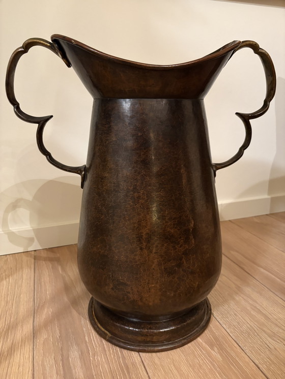 This exquisite vintage vase exudes a timeless charm, perfect for adding a touch of elegance to any space. Crafted from durable metal, its rich brown hue and graceful handles evoke a sense of classic sophistication. The vase's unique shape and patina tell a story of history and craftsmanship, making it a standout piece in any collection. Ideal for displaying fresh flowers or as a decorative object on its own, this vase is a testament to enduring style and quality. Inquire today to make this distinguished piece a part of your home decor.