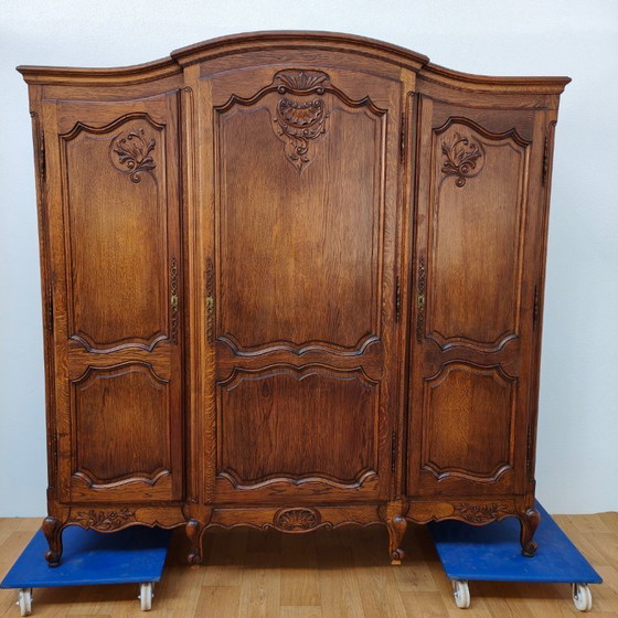 Enrich your bedroom with this authentic oak wardrobe. This imposing wardrobe exudes pure craftsmanship from the early 20th century. The warm, honey-colored glow of the oak wood instantly brings atmosphere and tranquility to your interior. Admire the unique details, such as the refined woodcarving with graceful floral motifs on the corners. The robust hardware and classic panel doors complete the picture. Behind the doors, you will find a wealth of storage space, featuring a mirror and a long hanging rail on the left side of the door. Behind the right door are shelves with a small drawer. Subtle patina and slight imperfections emphasize the unique vintage character of this cabinet. Use this showpiece as an atmospheric wardrobe or a stylish linen cupboard. This cabinet is a timeless eye-catcher that will last for generations!