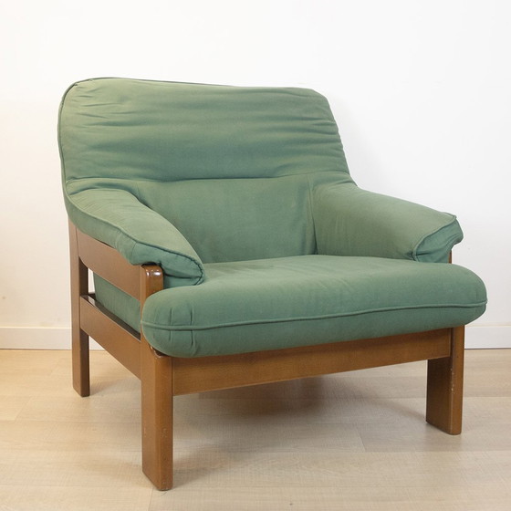 Beech wood armchair in walnut color with bottle green upholstered cushions, manufactured in Spain in the 1970's.