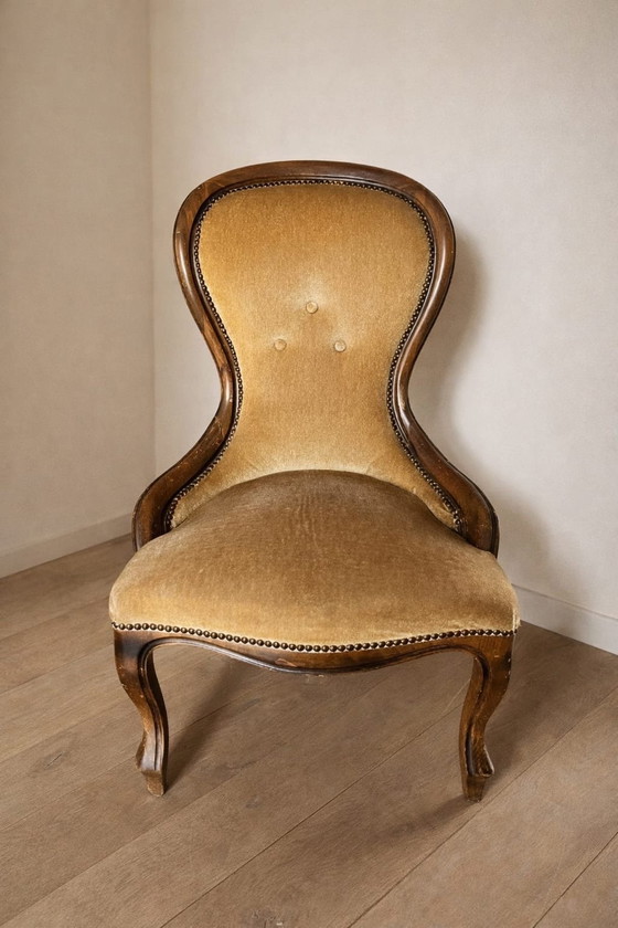 Elegant vintage armchair with a refined wooden frame and velvet upholstery in a warm gold/ochre hue. The organic shape of the backrest and the graceful curved legs give this chair a timeless and chic character. Finished with decorative furniture nails along the edges.