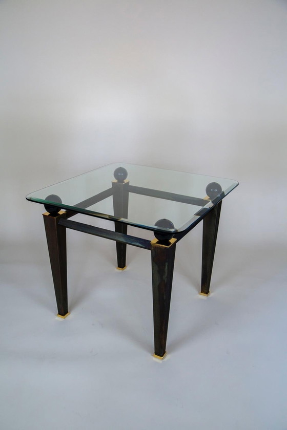 Coffee table from the 1980s. Made of metal, brass, and thick faceted glass. The tables are in very good condition. The tabletop is 8 mm thick.