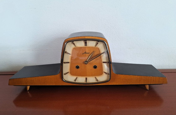 Vintage Art Deco-style table clock, Franz Hermle, mid-1960s table and mantel/mantel clock. Movement by FHS, Franz Hermle und Sohn. Model number 150-010 (8-day movement, with striking mechanism)