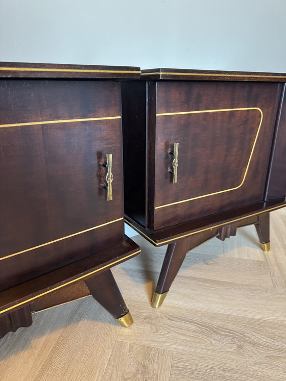 For sale: a beautiful set of two vintage nightstands with a chic appearance. The cabinets have a warm, dark wood color and are finished with subtle brass lines and elegant handles. The angled legs with brass caps give them a playful, mid-century / Art Deco look.