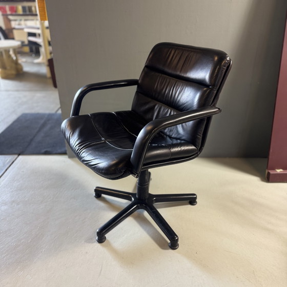 Spacious Artifort swivel chair executed in black leather designed by Geoffrey Harcourt. This vintage chair has a great look as well as fantastic seating comfort. Not height adjustable. The leather is beautifully supple and weathered, no holes or tears.