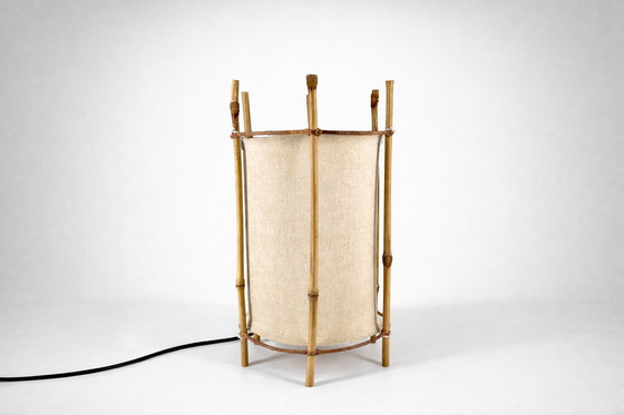 This elegant vintage bamboo table lamp with a fabric shade is a beautiful example of French mid-century design. Its construction and proportions are strongly reminiscent of the work of Louis Sognot, known for his sophisticated use of natural materials and his timeless, modern aesthetic.