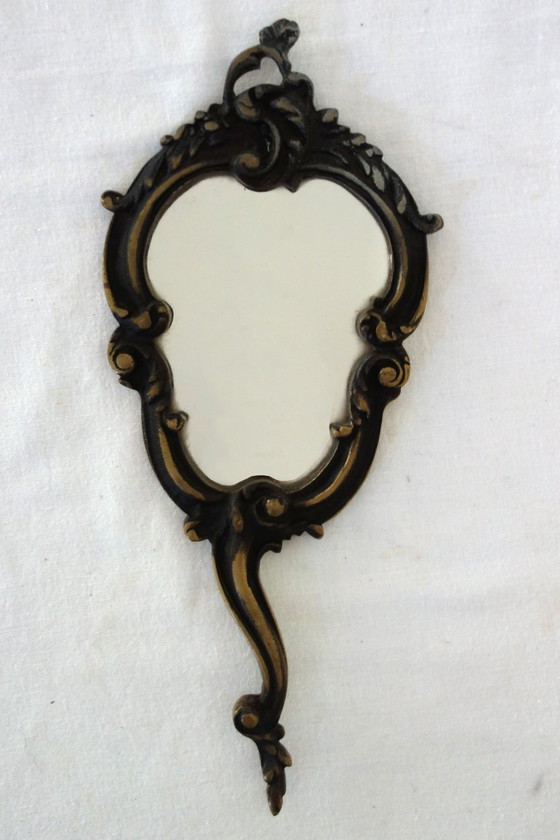 Lovely antique bronze/brass hand mirror. Beautiful patina and very good condition. Height 30cm, width 13cm Careful shipment