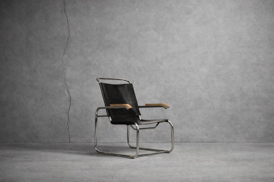 This design icon from 1928, the B35 armchair, was designed by Marcel Breuer in the late 1920s and made by the German Thonet factory in the early 1930s. This piece is made of tubular steel and black leather with natural patina. The materials used and the traces of wear show that this is an early production of this timeless modell. The armrests are finished with solid wood. Following the success of his Wassily chair, Breuer continued to experiment with tubular steel furniture. Like the Wassily chair, the B35 was not a direct representative of the Bauhaus school, but is clearly in line with the Bauhaus design and construction principles, with a modern, stripped-down form made of industrial materials not used today in furniture production.