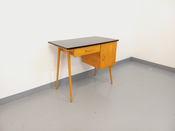 Vintage Baumann desk from the 1950s, light beechwood frame and splayed legs, black wood top, one door with two sliding shelves, one drawer, brass handles.