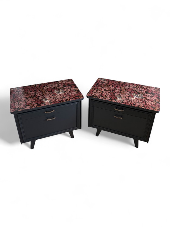 These vintage tables have been professionally restored and given a new design. The top is covered with the designer wallpaper 'Cole & Son Fornasetti Senza Tempo II Wallpaper Foglie e Civette'. The vintage table has handleless drawers.