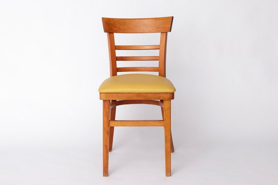 The seat has been newly reupholstered in vibrant yellow faux leather, adding a cheerful mid-century touch.
