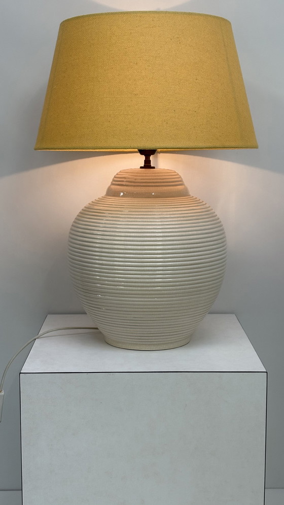 Vintage beige/cream French design large ceramic table lamp with original vintage Kostka crackle finish, a ribbed pattern, and a mustard yellow fabric shade.