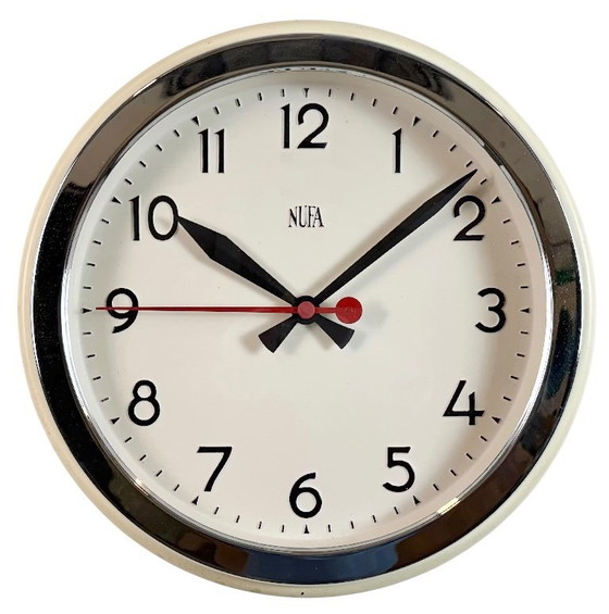 Vintage school or factory wall clock produced by NUFA (Nederlandse Uurwerkenfabriek) in Netherlands during the 1960s. It features a beige iron frame with chrome plated edge,an iron dial, an aluminum hands and a curved clear glass cover. The piece has been converted into a battery-powered clockwork and requires only one AA-battery. Measures: Diameter 32 cm. The weight of the clock is 1,2 kg.