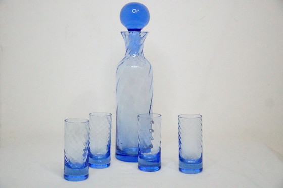 Beautiful vintage glass set in a stunning shade of blue. The set includes one elegant decanter with a large spherical stopper and four matching shot glasses. The glass features a delicate, stylish twisted (optical) texture that catches the light beautifully. Perfect for serving spirits or as a decorative mid-century modern accent for your home bar.