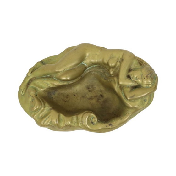 Elegant brass ashtray or vide poche, featuring an image of a naked reclining woman, Art Nouveau style, second half of the 20th century.