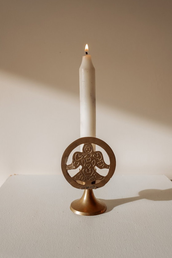 A truly adorable vintage brass Christmas candlestick. This candlestick features a little angel on the back, making it especially lovely for the holidays. Suitable for regular dinner candles.