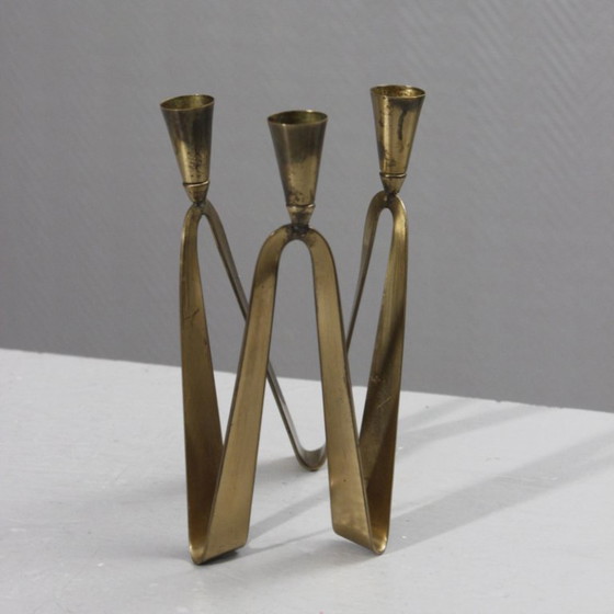 Beautiful three-light tripod candlestick in brass with a minimalist modernist design.