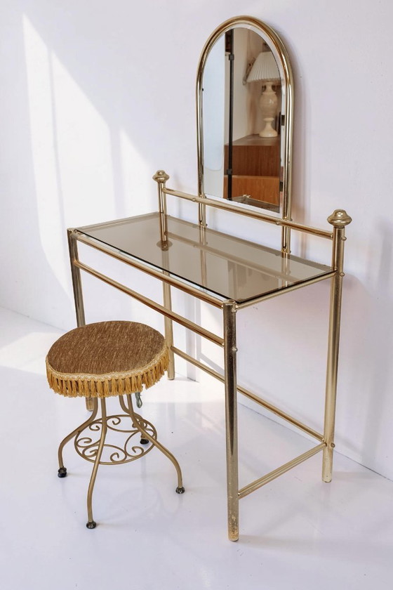 Beautiful vintage brass vanity set consisting of a dressing table with a mirror and smoked glass top, and a matching stool with a gold-yellow velvet seat.