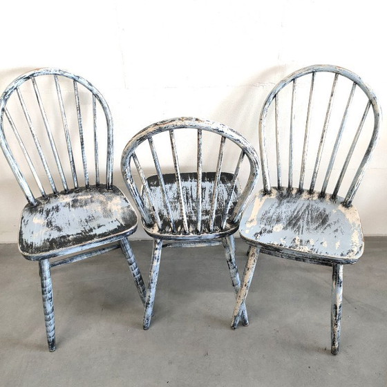 Beautiful set of crafted chairs. The previous owner painted them several times and last decided to sand them down. This gave these chairs this color style. We thought they turned out great, sturdy, brocante, lively and cozy. Seats great, ideal for a round table or as a nice side chair. Ideal also to use as a plant table. Please contact us for delivery, we have our own couriers for the Netherlands and Belgium. Keep in mind that these chairs are a set of 3, and therefore delivery costs may vary as the dimensions below are for 1 chair.