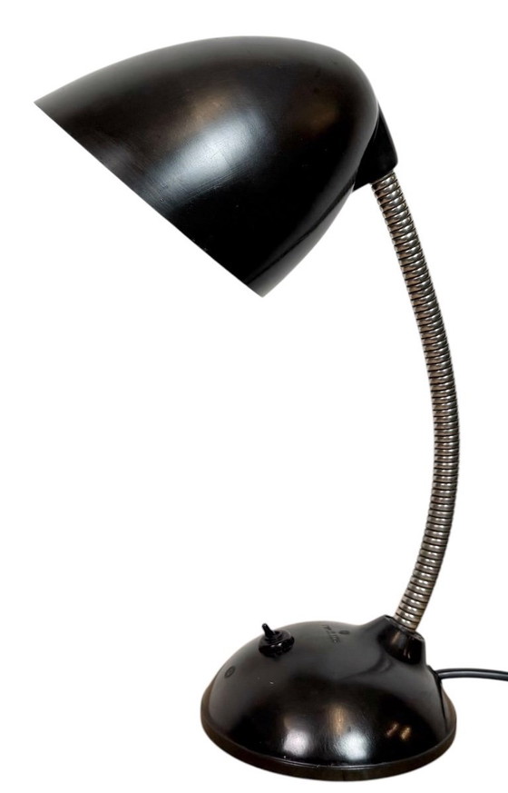 Brown industrial adjustable gooseneck table lamp made by Elektroinstala in former Czechoslovakia during the 1950s. It features a bakelite shade and base and iron gooseneck.The original socket requires standard E27 / E26 lightbulbs. . New wire. Good vintage condition..