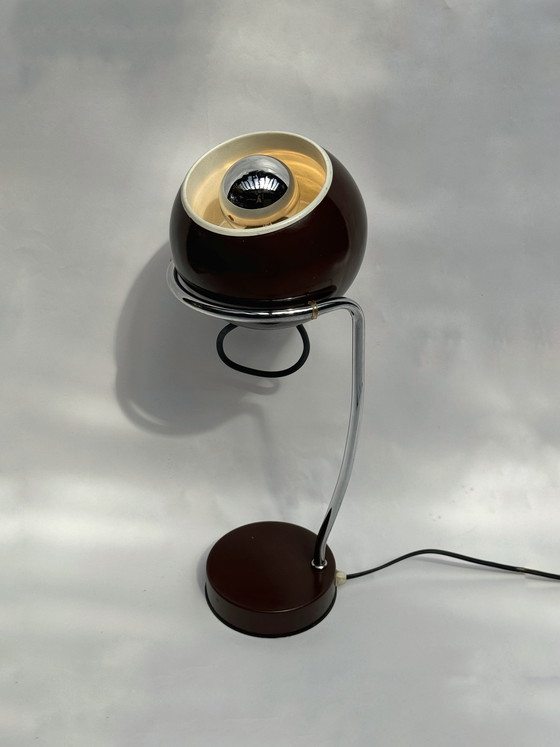 Beautiful vintage brown eyeball table lamp, likely produced by Gepo Amsterdam in the 1970s. The lamp features a chrome frame, a brown base, and a matching brown eyeball shade. The shade rests loosely on the elegant frame, allowing you to easily adjust the direction of the light as desired.