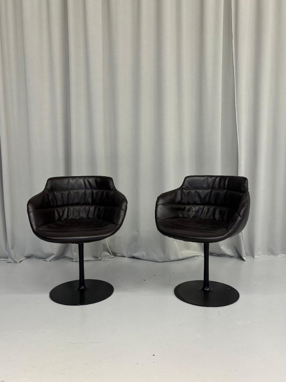 Step into the elegance of the 1980s with this exquisite set of two vintage swivel cocktail chairs from Italy. Crafted with a luxurious brown leather upholstery, these chairs exude sophistication and timeless style, making them a perfect addition to any refined living space or office setting. Their sleek design and swivel functionality offer both comfort and versatility, allowing you to enjoy a seamless blend of form and function.