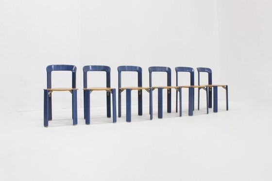 Set of 6 vintage Bruno Rey dining chairs, designed by Swiss designer Bruno Rey for Dietiker in Switzerland in the 1970s. Iconic design model 3300, this edition in beech wood with a blue color. Vintage chairs with signs of wear consistent with their age. Some scratches and stains on the wood. Dimensions: Height 78 cm, Width 44 cm, Depth 44 cm, Seat height 45 cm