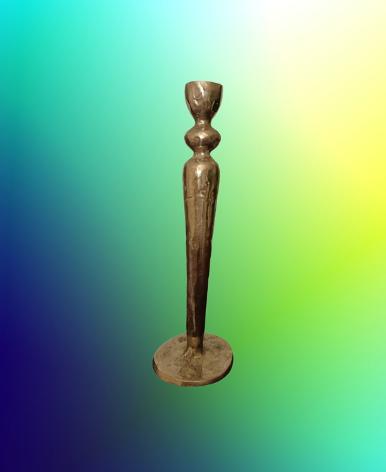Add a touch of authenticity and vintage charm to your home with this 1970s brutalist candlestick. Its sculptural silhouette and raw metal finish captivate the eye and reflect light with unique elegance. This candlestick is a perfect example of brutalist design, with its bold geometric shapes and rich texture. Ideal for creating a warm and sophisticated atmosphere for your evenings, it's ready to illuminate your space in style. Don't miss the opportunity to add this vintage piece to your collection.