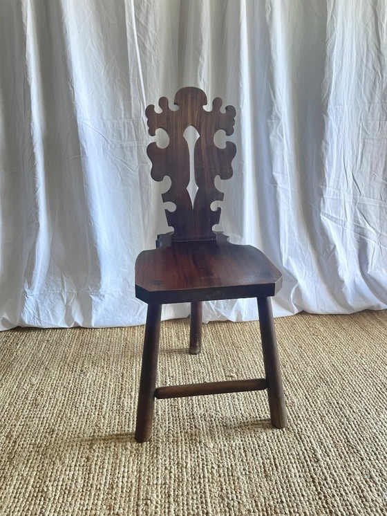A primitive tripod chair in carved wood. A remarkable mid-century Brutalist chair, handcrafted from solid oak, with a sculptural back and rich grain. This chair combines rustic craftsmanship with bold architectural lines, characteristic of 1950s modern mountain design.