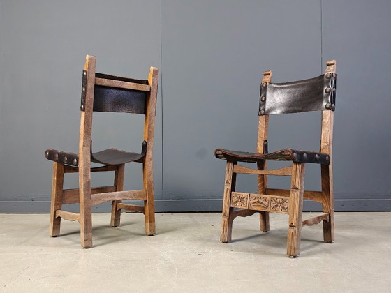 Vintage rustic dining chairs with beautifully patinated dark brown leather seats and a solid oak frame.