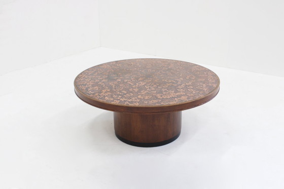 Vintage wood and copper round coffee table with a brutalist design, copper-plated tabletop, and a wooden base. Timeless design and attractive color that blends well with most interiors. In good condition with minor traces of use consistent with age, small stains. 1970s - Germany