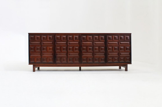 Vintage Spanish Brutalist sideboard with a geometric paneled front. Beautiful piece from the 1970s, Spain. Excellent wood craftsmanship. Plenty of storage space with 4 doors. In good condition with minimal signs of use consistent with its age.