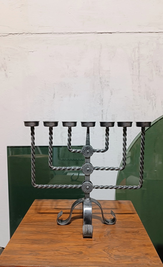 Vintage brutalist wrought iron candlestick, with 7 arms. The front and the back sides are identical. Height 38 cm Width 44,5 cm Depth 21 cm