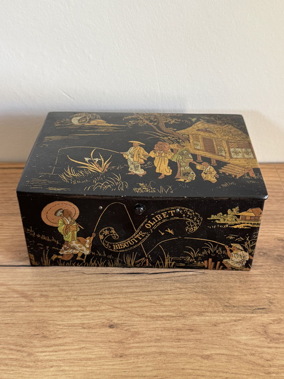 Charming Olibet biscuit tin made of boiled cardboard, decorated with chinoiserie motifs from the Napoleon III era.