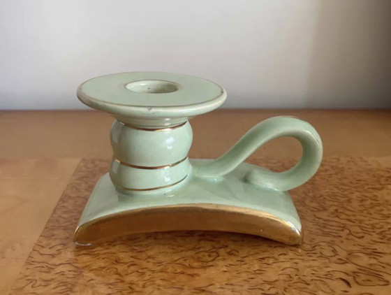 Pale green and gold ceramic candleholder. Very good condition. Dimensions : H7 x W12 x D6