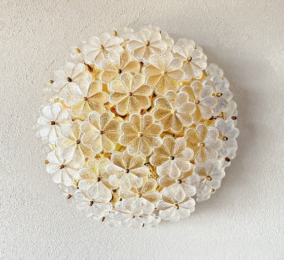 Beautiful mid-century design. Large 1970s ceiling or wall lamp made by the German company Ernst Palme. Round brass base with 6 E14 sockets, each with 42 crystal flowers. This atmospheric lamp is in excellent vintage condition.
